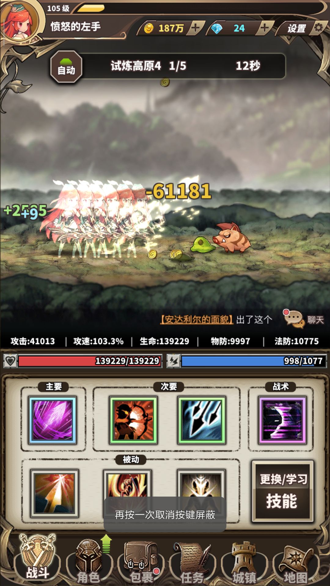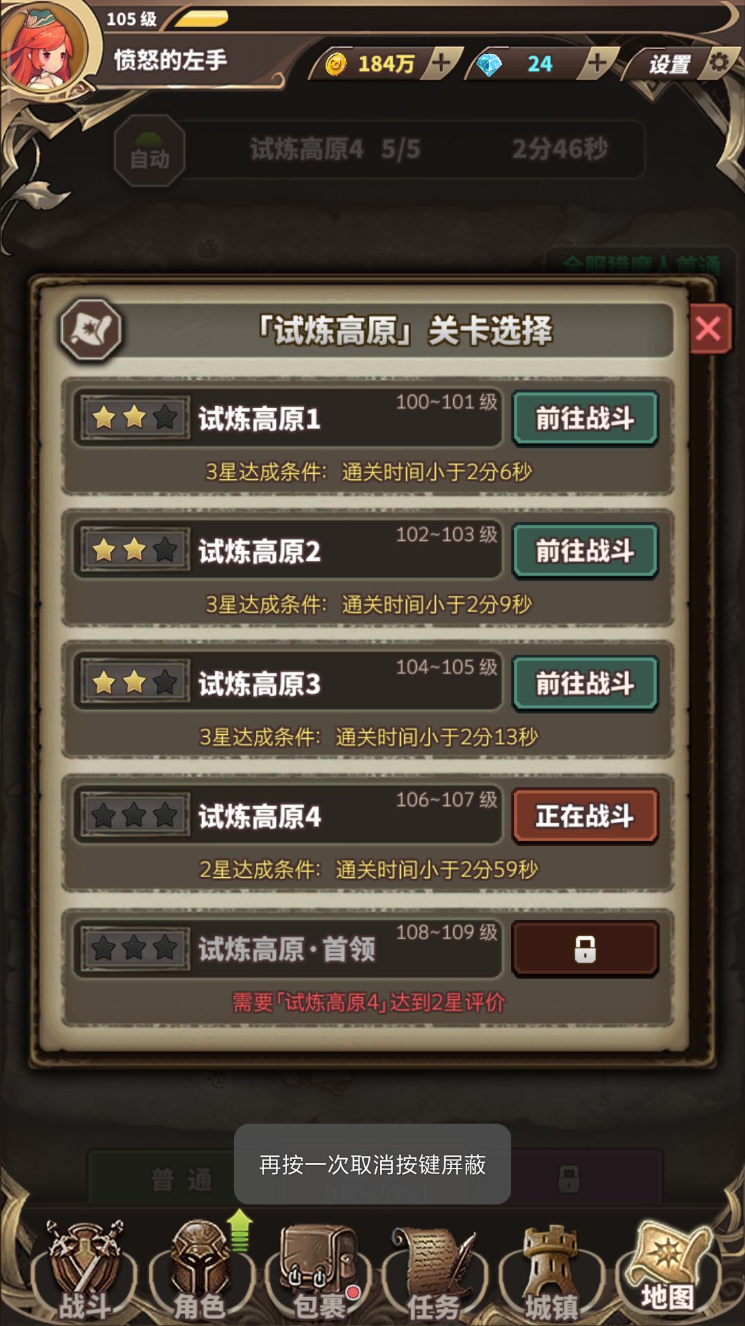 这个虽然是个挂机游戏,但是手动和自动肯定不一样,有的图自动只有一星,手动就可以两星,所以有的图只差那个十几秒就可以两星的话可以试试手动,说不定就过了。(下面附一张本人的进度吧,越级到没有,正好平级吧)