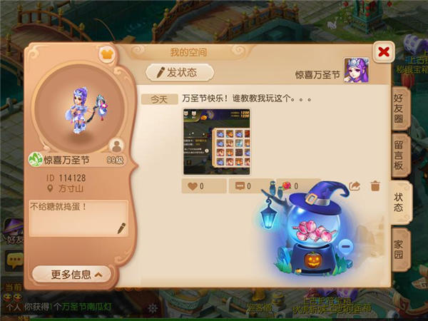 逐家逐户索取糖果,是万圣节经典的节日习俗。活动期间,玩家每天都可以找5个场景中的NPC对话,答对他们的问题即可索取糖果。除此之外,参与师门任务、捉鬼任务、日常副本、秘境降妖玩法时,也有机会获得糖果。每获得一颗糖果,个人空间的糖罐中便会自动加入一颗神气糖。
