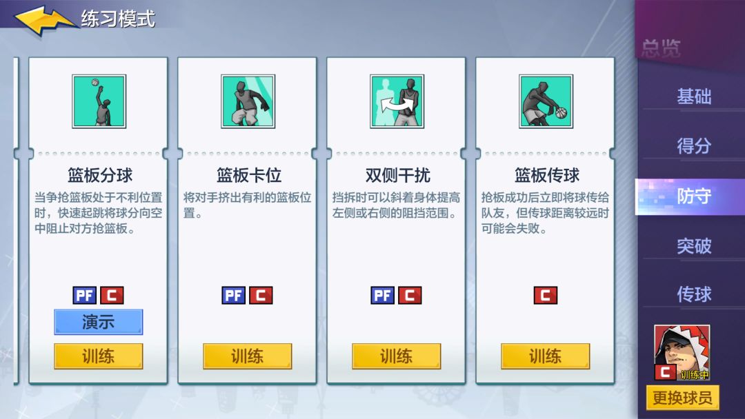 在练习场界面,分位基础、得分、防守、突破、传球几大块,玩家还可以选择更换球员进行训练。值得一提的是更换的球员只能是训练界面中的三名球员之一,且各项训练会根据球员的位置而进行针对性改变,例如外线球员在防守训练模块只有强力盖帽,而中锋有篮板分球、双侧干扰、后盖追帽等技能可供训练。