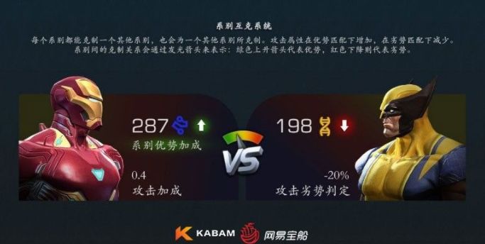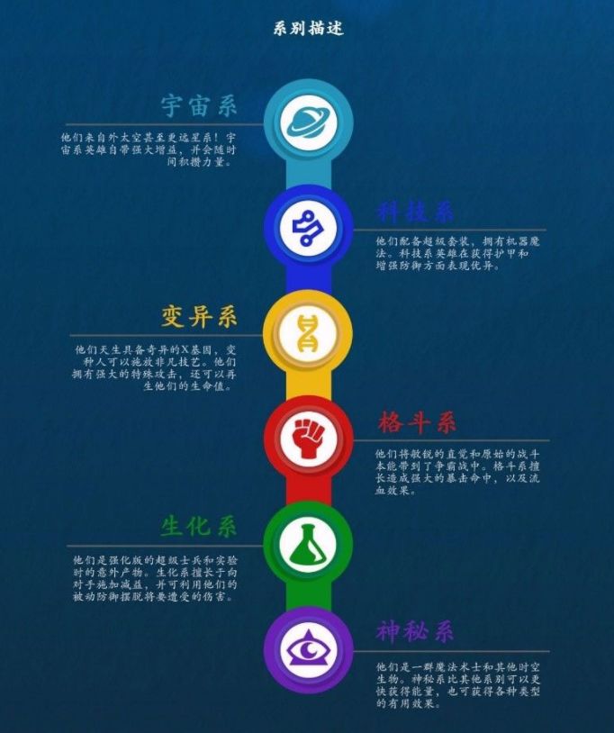 没个英雄都有自己的系别,比如钢铁侠就属于科技系,美国队长属于生化系,金刚狼属于变异系,不同系别之间会互相克制,克制敌人的一方会获得战力加成,被克制一方战力被削弱的同时很多超能力也无法发挥出作用。