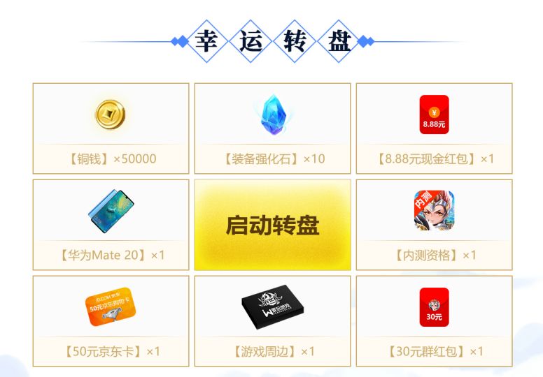 为了增加玩家获取首测资格的机率,特意开设了【幸运转盘】活动,玩家可以每天在官网中抽取首测资格,同时还将有机会获得华为Mate 20、京东卡、游戏周边等礼品~不过幸运转盘功能在1月18日才会上线哦~