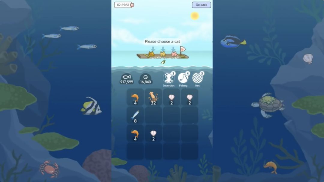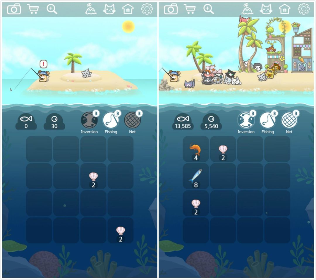 游戏中最基本的单位是贝壳,接下来能两两合成虾米、小鱼、螃蟹、章鱼等各种海洋生物。攒了足够的鱼干,就可以领养新的猫咪,或是修建新的建筑,捕获的最大的生物后,便能前往其他岛屿。