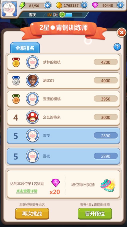 大赛为训练师大赛,这里汇聚了全服的训练师高手,在指定的时间内完成规定的训练动作,精准和完成速度是评判每次训练动作品质的关键。如果失败了没关系,你还有再次发起挑战的机会。每晋升一段就会获得相应的奖励,隔一段时间全服排名便会刷新,而你的成绩越高,当天的奖励也将会越丰厚。