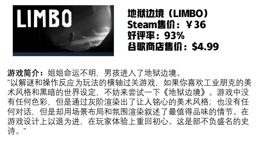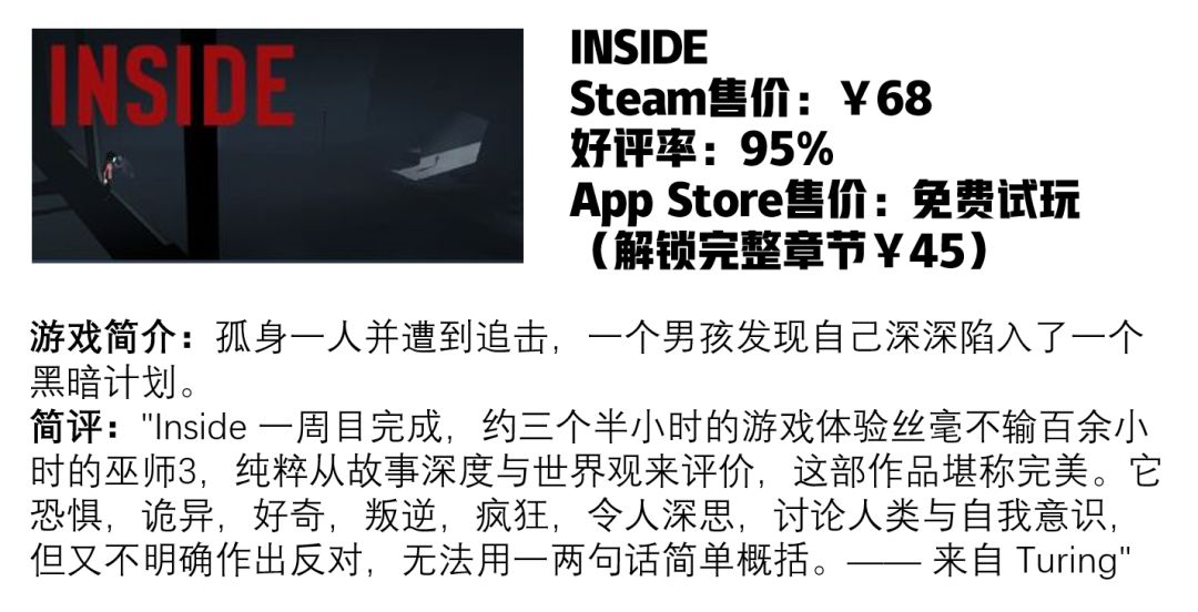 这两款游戏就放在一起讲吧,两款游戏的类型都是横版卷轴类型的过关解密游戏,游戏的流程并不是很长,卡关的话查查攻略也很轻松就能过,游戏画面和音乐都比较压抑,结局令人深思,尤其是inside旳隐藏结局。