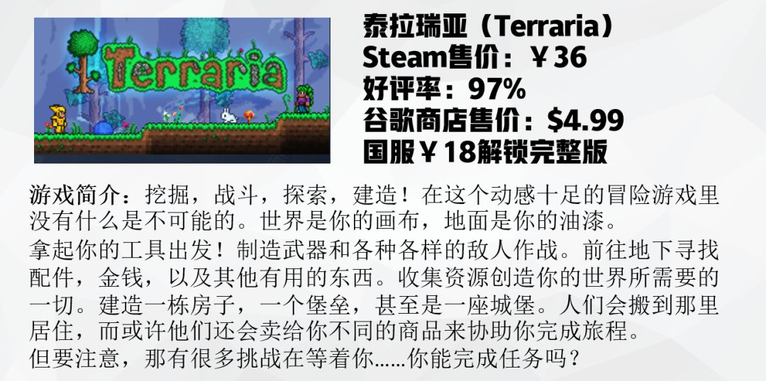 极高的自由性,探索地图,挖矿,打BOSS,建造家园,十分推荐联机与朋友一起玩,可以让游戏更加快乐。