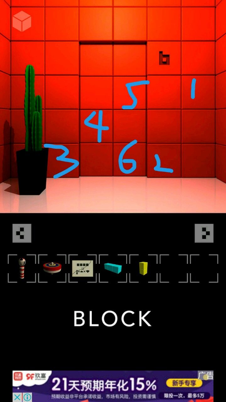 墙上一门打开,点黄按钮开灯试点上下左右按钮得知需要橙蓝黄绿四种颜色数量,后退右转,有有两个小门,左下角门提示要输入密码,右上角门是一个柜子模型,后退右转,那小门里的黄板,该小门关闭开启另一扇小门,进入新房间。 新房间分为武六区画面,柜子画面,红门画面跟屏风画面。 武六区画面我们先看武六区挂画那的拼块,转动数数发现提示1:橙3,蓝2,黄3,绿5。后退点开右边下面两侧门,根据黄板上去掉首与末的横左右顺序(从上往下)为右右左左右右,根据此顺序点两侧门里侧面的板子,最后点中间的门得另一块板子。