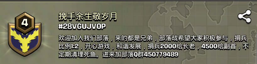 一个4级小部落,目前有30多人,首领非常友好,捐兵的话,部落里的人都是有兵就捐,没有太多规规矩矩,但是要活跃,不管你是萌新还是大佬都非常欢迎加入,进来一起发展,一起努力!