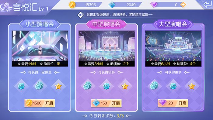 音悦汇创建的演唱会分为小型、中型、大型演唱会3种,每种演唱会消耗的道具不同,其中小型演唱会、中型演唱会消耗的金币、点券可以从游戏中获得,而大型演唱会需要消耗钻石。大型演唱会的奖励最为丰富,创建者和助演者都能获得奖励,所以当小主人们看到舞团中有人开启高等级演唱会时,为了提升奖励可要火速参与助演哦~