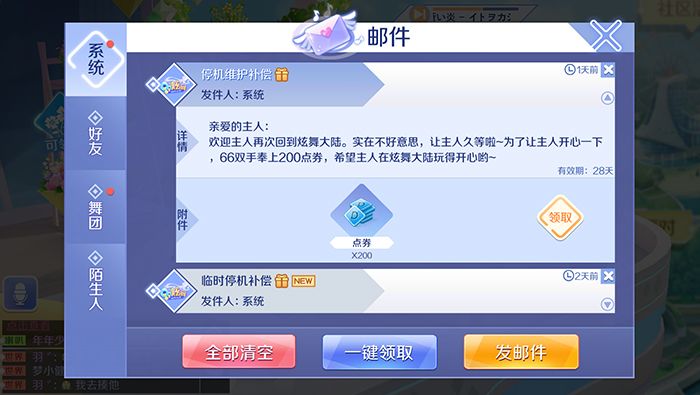 成功完成演唱会后,并不会直接在界面中提示奖励,还需要小主人们去邮箱中领取才可以获得。邮箱在主界面左侧的阳台,进入后点击邮箱,然后直接点击下方的一键领取按钮即可。通过音悦汇中的演唱会,小主人们可以每日稳定获得舞团币,通过积累可以在舞团商店,兑换各种道具、服饰。发家致富,成为潮流icon指日可待呀~