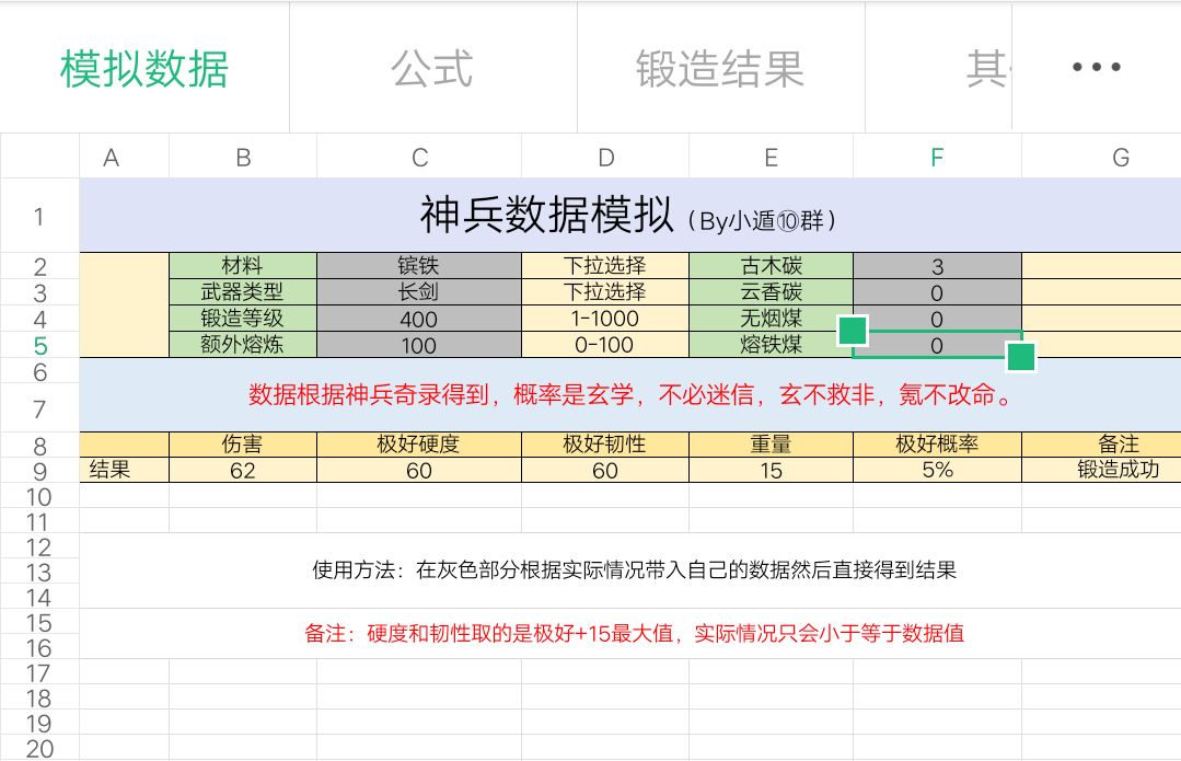 如果懒得计算上述过程的少侠,可以去找小遁大佬的<放置江湖神兵重铸模拟表>,可以直接用表计算出结果。