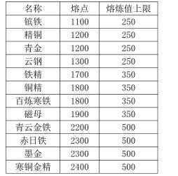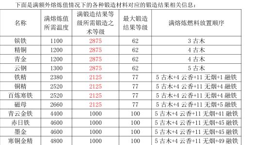 锻造材料熔点:详情见下图。此处需要注意的是熔炼值是有上限的,到达上限之后再加煤就是浪费资源了。
