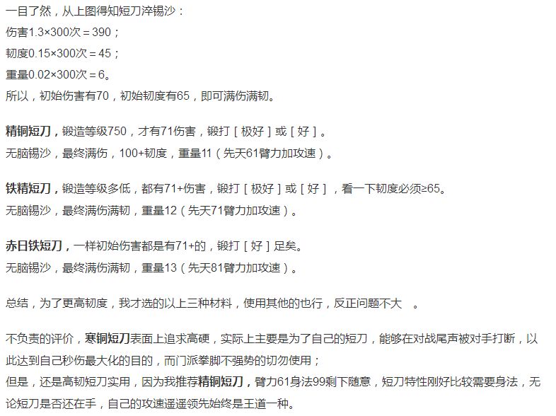 本着经济实惠兼顾逼格的原则,我们选铁精作为锻造材料。锻造等级就随便吧,来个666,投入5古木4云香11无烟1融铁煤10遁地符,打造短刀。代入神兵出炉伤害公式计算,得出武器出炉伤害为96。按照攻略无脑粹锡沙。这里注意,在淬炼到第279次的时候,武器伤害=96+1.3*279=458.7,如果再粹一次锡沙刚好460。为了卡到461,有好几个办法可以尝试,可以完成这个目标。一是直接把锻造等级提升到675级,这样神兵出炉伤害就会提升1点,那么淬炼279次锡沙后,伤害就变成了459.7,再粹一次锡沙刚刚好461。二是可以调整之前的淬炼方案,比如淬炼278次锡沙后,再淬炼1次陨铁,那么当前神兵的伤害就变成了:96+1.3*278+1.2=458.6,之后继续淬炼1次锡沙,伤害就达到了459.9,之后无论淬炼什么材料,都能到达461。