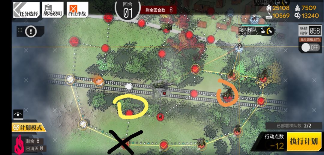 ①这关打捞有一个无法避免的问题就是下图中橙圈位置的绿无敌偶尔会在第四回合结束即打捞队走到打叉机场位置时巡逻到黄圈位置,然后KO掉你的打捞队(离婚警告),所以由此路线产生的意外本人不承担任何责任。(ಡωಡ)hiahiahia