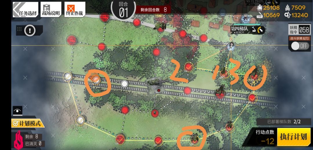 我因为比较懒 所以画了个全自动路线,但依然有无法解决的问题存在,后面会写。这一个路线可以囊括所有判定点,开局下打捞队,往下走一格下守家队。之后三步按图上的数字序号走,然后点击图上画圈位置就可以完成路线规划,后面就是让她们自己动了。![[嗒啦啦2_乖巧]](https://img-tc.tapimg.com/market/images/e1c24f8566fda8255009cae7e503676c.gif)