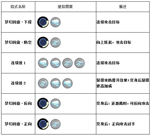 另一个是梦幻回旋正向(↓→突进)以极快的速度瞬移至敌人面前攻击的技能。