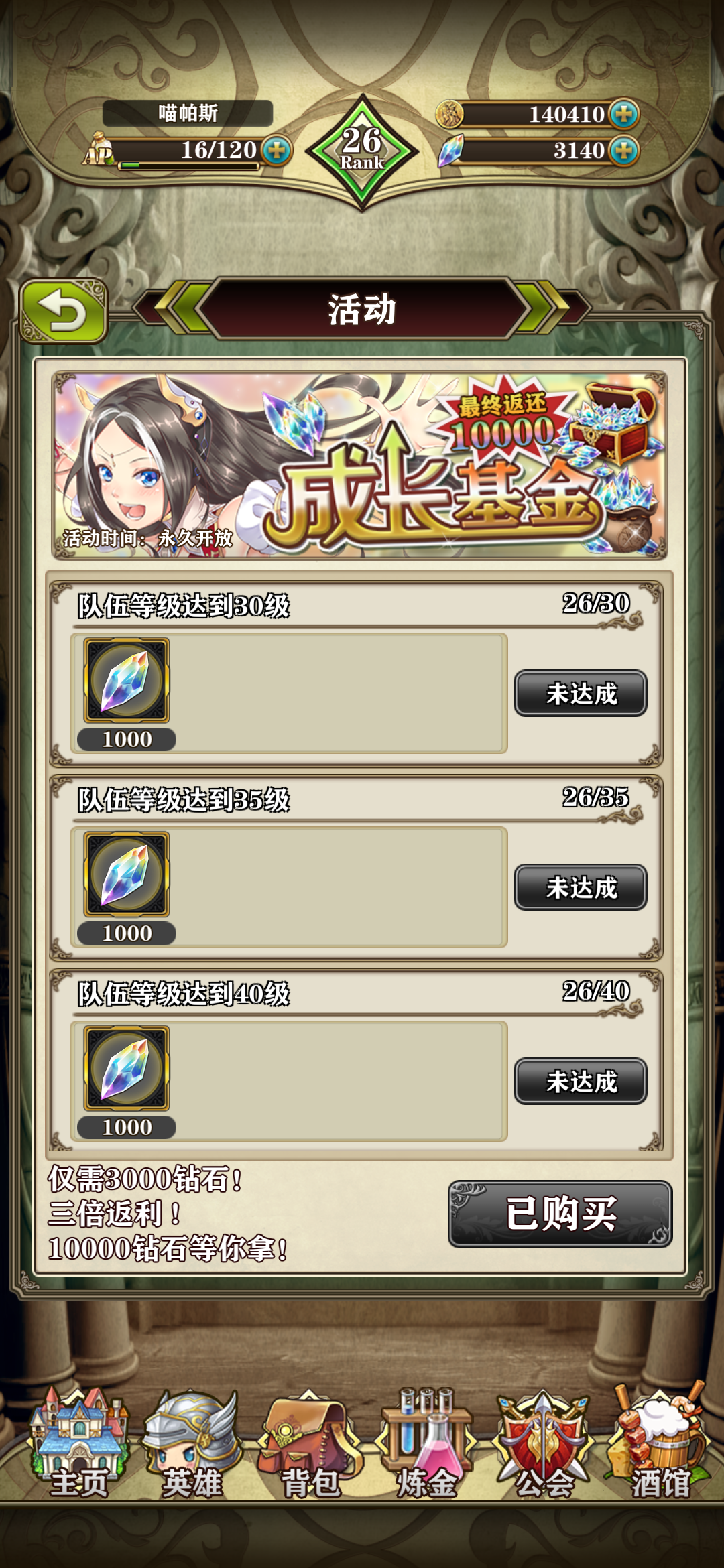 差不多吧等级刷到三十级会有3000钻石,可以用来买成长基金。买了可以直接领3000,后续没升10级可以领1000