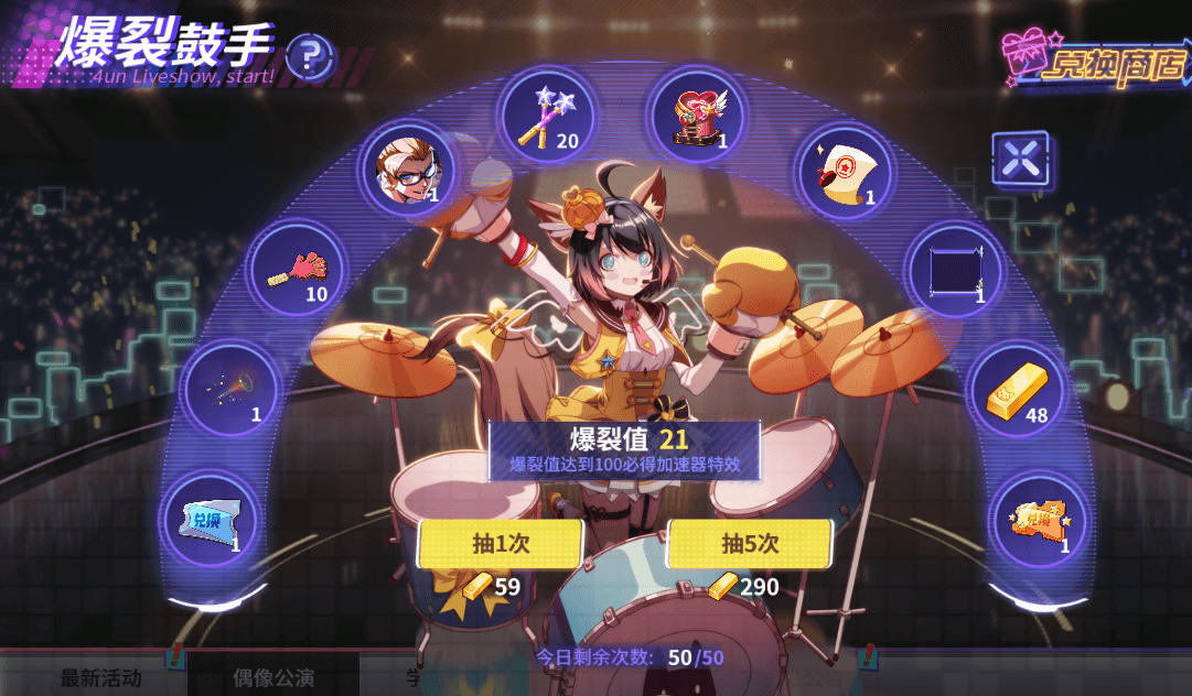 爆裂鼓手玉子等你来挑战!使用金砖即可参与活动,当玉子的鼓声停止时,光标落在哪里,就可以获得哪里的奖励。奖池包括:永久英雄·增长、588时装兑换券、288时装兑换券、加速器特效“闪耀登场”、弹幕气泡“乐团出道”、十月宝箱、合同文本、应援荧光棒、金砖、拍手器等。每次抽奖都会积累爆裂值。若此前未获得该奖励,则当爆裂值达到50时,必得“乐团出道”弹幕气泡;当爆裂值达到100时,必得“闪耀登场”加速器特效!已获得的“乐团出道”弹幕气泡和“闪耀登场”加速器特效不会重复获得。当爆裂值超过100后,不再显示爆裂值。