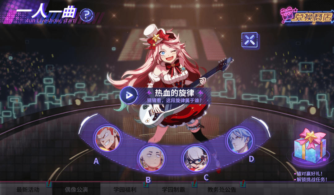 贝斯手琰萝每天都会弹奏不同的曲子。每首曲子都对应着一名非人学园的英雄,你能猜出正确答案吗?点击播放按钮欣赏乐曲,然后在四个选项中选出正确答案,即可获得偶像纪念礼包!打开后随机获得下列奖励之一:金砖*100、4un·DRUM体验卡(1日)、4un·KEYBOARD体验卡(1日)、4un·VOCAL体验卡(1日)、应援荧光棒*10、金砖*5。完成答题后,还会解锁当天的挑战任务。完成挑战任务,可以获得大量应援荧光棒,前往兑换商店兑换专属奖励!每日曲目刷新时间是凌晨4点。