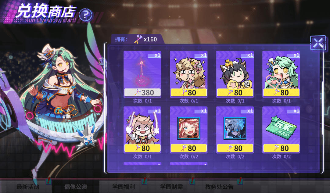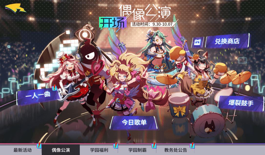 4un的偶像公演进行中,使用应援荧光棒即可兑换键盘手文曲星的礼物!应援荧光棒可以通过完成今日歌单的每日任务,完成一人一曲的挑战任务,或参与爆裂鼓手获得。可兑换的奖品有:回城特效“新星偶像”,狮妹4un专属表情,玉子4un专属表情,文曲星4un专属表情,琰萝4un专属表情,大鹏时装“Eii·掠天之翼”体验卡,琰萝时装“4un·BASS”体验卡,改名卡,金砖小宝箱,拍手器小宝箱等。部分奖品有兑换次数限制,请同学们注意。