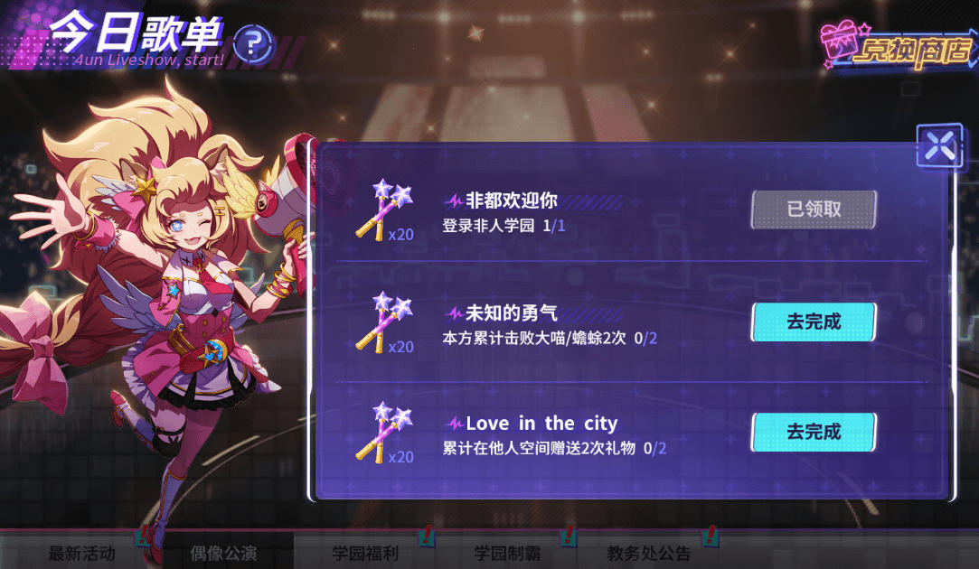 4un的偶像公演进行中!今天想听狮妹唱什么歌呢?活动期间,今日歌单页面每天都会刷新3条任务,完成后即可获得道具“应援荧光棒”,前往兑换商店即可兑换专属奖励!每日任务刷新时间是凌晨4点。