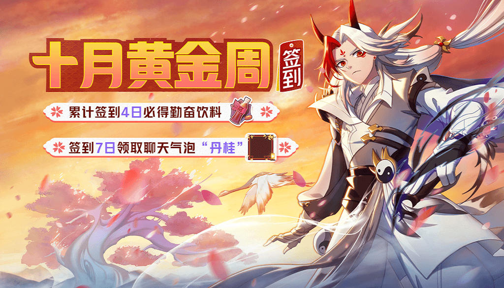 每月的约定,十月黄金周签到活动如期开启!累计登录4日即可领取勤奋饮料,累计登录7日即可获得聊天气泡“丹桂”。