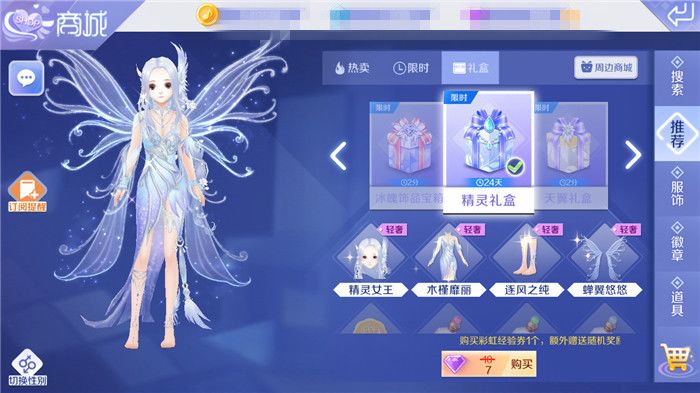 在8月2日至8月30日登陆QQ炫舞手游商城中,可以购买到原价10钻石,现价7钻石1个的精灵礼盒。女生购买这款礼盒,有机会获得“精灵女王”发型、“木槿靡丽”套装、“逐风之纯”腿饰和“蝉翼悠悠”蝴蝶翅膀等服饰道具,这款蓝色系的精灵服饰,体现了神秘深邃之感,搭配透明的蝉翼翅膀,十分灵动。
