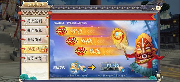 在全新版本开启后,还有各种福利活动也向大家开放哟(活动时间敬请留意)听说在活动期间,章节副本打怪将获得双倍经验,双倍铜钱和双倍掉落哦