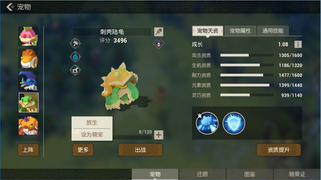 在宠物界面,点击【更多】按钮,选择设为骑宠