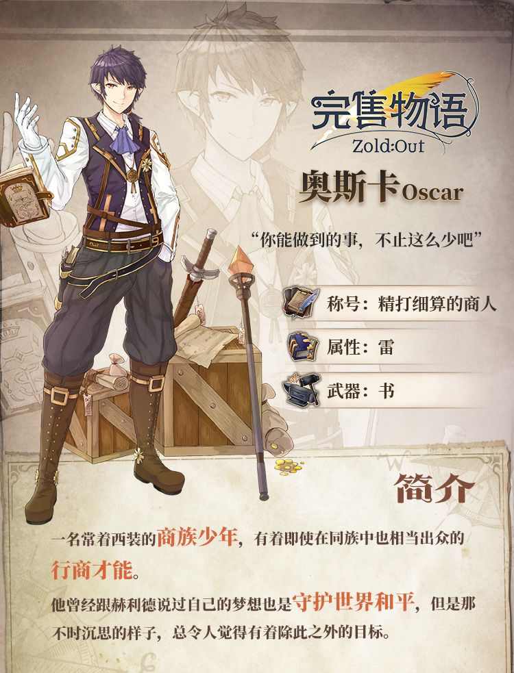 奥斯卡是一名来自商族的少年,有着即使在同族中也相当出众的行商才能,赫利德的骨子里流淌着一股热血的力量,他的梦想是成为一名守护世界和平的武器锻冶师,两人优势互补,展开了稳定的合作关系。赫利德是一个名副其实的行动派,相比起行动之后的后悔,他更加在意现在的自己能做上点什么。带着这样一份行动力,他们许下了将武器店生意发展到全大陆的目标,走上了通向远方的冒险旅程。
