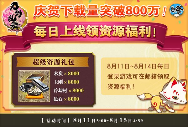 为了庆祝《刀剑乱舞-ONLINE-》中文版下载量突破800万,感谢审神者们的始终如一的支持,在活动开启期间,审神者们登录游戏即可在邮箱内领取超级资源礼包。