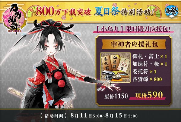 为了配合800万下载量达成时开启的小乌丸限锻活动,万屋开启【小乌丸限时锻刀应援礼包】售卖。