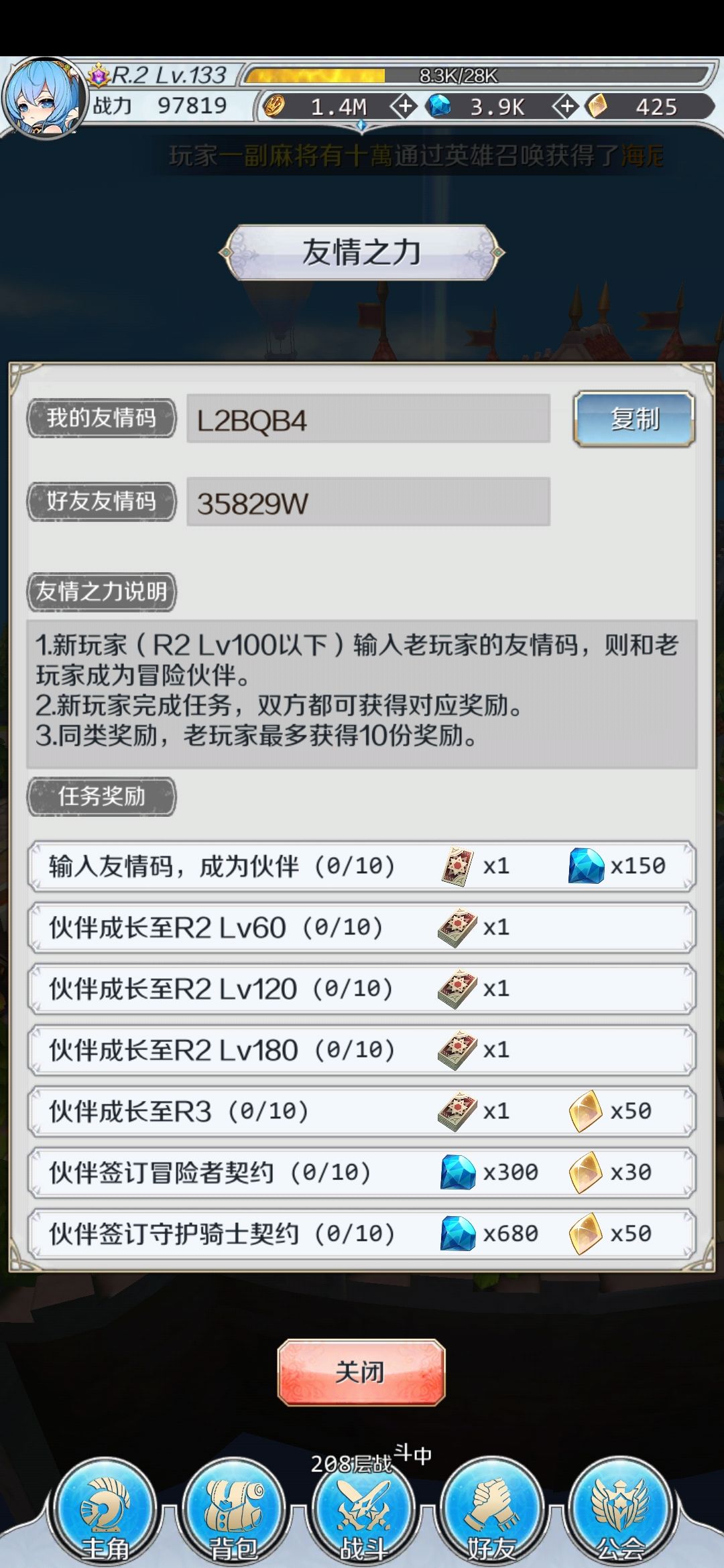 2.如果基友码不是互填也没多大关系,自身账号要求达到也会得到奖励(和基友一起)。这个就不用多说了,游戏里有说明(算上自己填写的基友,奖励全拿的话是11次)。