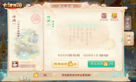 玩家通过提交“蓬莱海螺”、每日活跃度奖励以及在小程序内预约或抱团抽奖,都可以获得“寻龙线索”。通过消耗指定数量的“寻龙线索”,玩家可以尝试破译传闻中的龙族信息,成功破译线索的玩家将能获得一份破译奖励。当有100名玩家破译成功后,这份消息将推送给所有玩家,同时,大话还会在这100名玩家里随机选择一名成为寻龙先锋,送出特殊的召唤兽奖励!