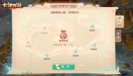 寻龙之路任重道远,需要集结三界侠士们的力量,才能事半功倍。为了嘉奖踊跃参与寻龙的侠士们,当加入寻龙团的玩家数量达到指定人数时,寻龙团成员们将可以领取先锋礼包,并有机会通过礼包内的全服性抽奖获得珍贵的2019鎏金宝鉴!除此之外,邀请自己的好友加入寻龙团,也能够获得特别的邀请奖励!