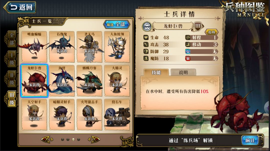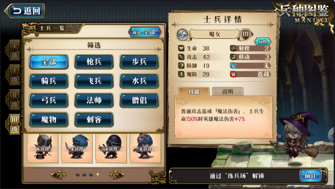 在练兵场界面可以进入兵种图鉴,兵种图鉴中可以清楚的了解每个兵种的数值面板、属性、技能、获取方式。