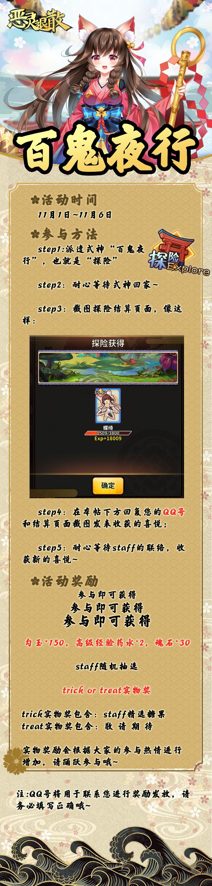 那么为了让东方的妖怪们也感受到过节的愉悦,小狐狸决定为所有节日期间参加探索的式神增加福利,按照下图的方法参加即可获得: