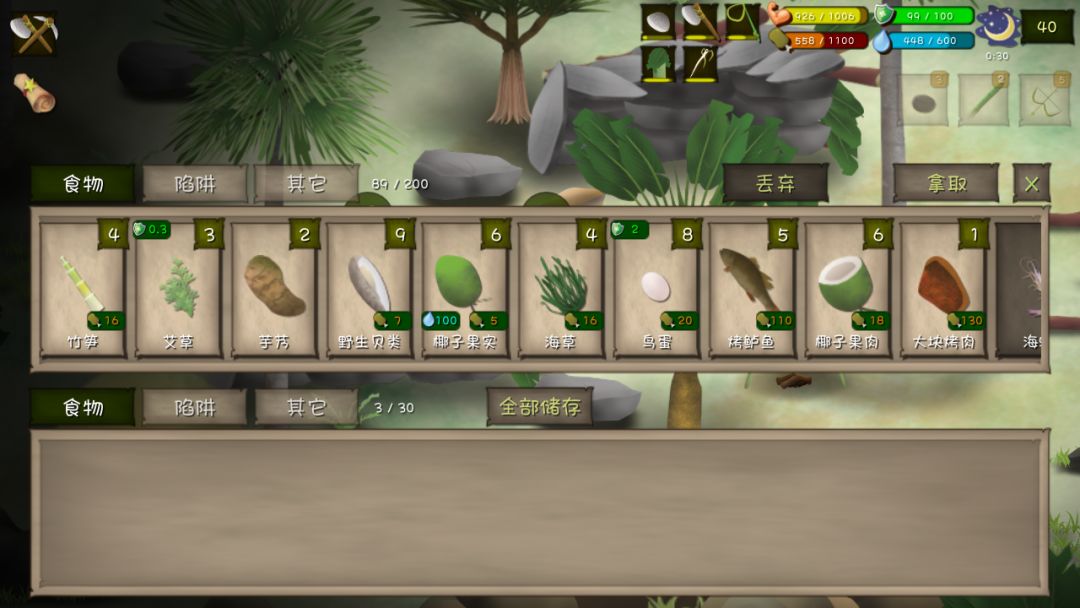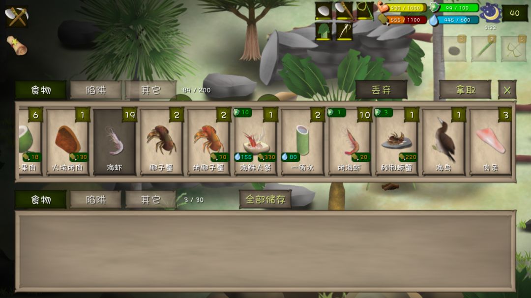 海鸟可以开出一大小肉,海虾,四脚蛇,椰子蟹,鸟蛋,螃蟹好像是,大龙虾它是用来做隐藏任务的,比较少见就不说了(40天我只遇到1只😂),想叉鱼最好去左上角叉,运气好可以一次叉三只