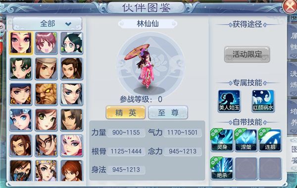 最后我介绍下盖世豪侠中一些稀有的0级伙伴首先是首冲赠送的林仙仙:(内功)型伙伴,主动技能是范围的技能伤害在造成伤害的同时也能为自己提供更高的暴击几率,在战斗中能提供更高的暴击伤害,被动技能是在击杀之后能提供高额的额外的伤害。也就是说在战斗中只要先击杀对方人物就能给林仙仙提供暴击和额外的增益状态,提升团队的群体伤害。总结适合在爆发较高的队伍和组合中能发挥出高额伤害的一位伙伴。
