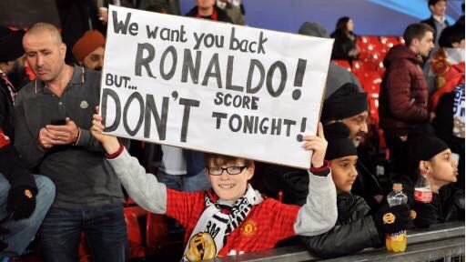 C罗在曼联时期更是万人迷,甚至举的牌子上写到金球属于罗纳尔多。离开曼联后去往皇马更是举下图的牌子