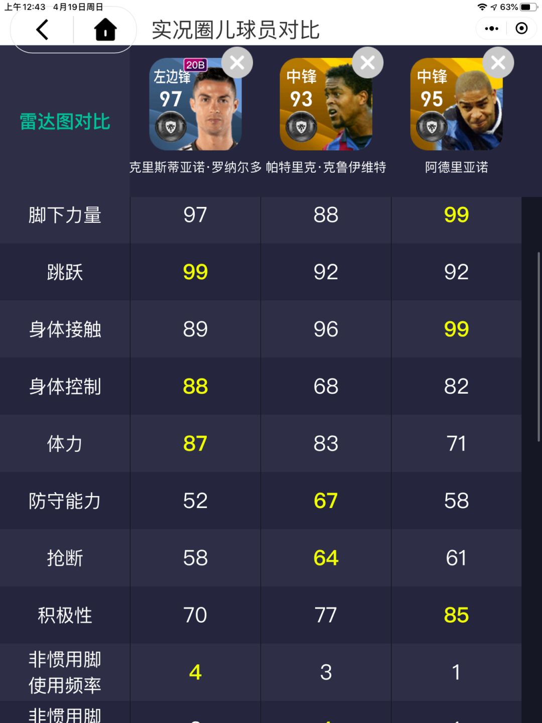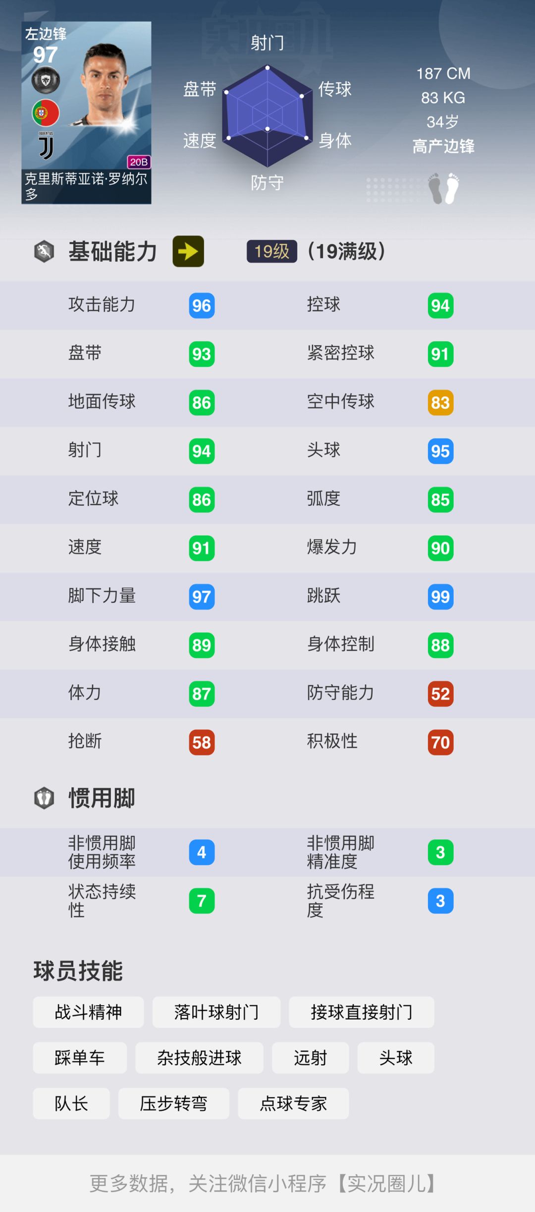 C罗的传控与紧密控球分别有94、93、91,在187的身高上基本是巅峰数值