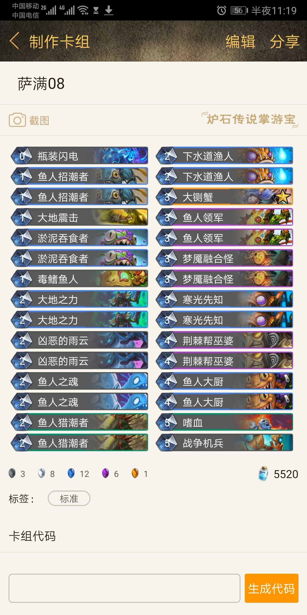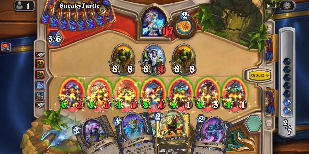 添加解卡和取消没有什么用的元素反应,效果比之前好太多,注意瓶装闪电是对所有随从(啊,经常被坑)战争机兵经常不想裸上,除非没怪上。之后就有了第三个版本的鱼人萨