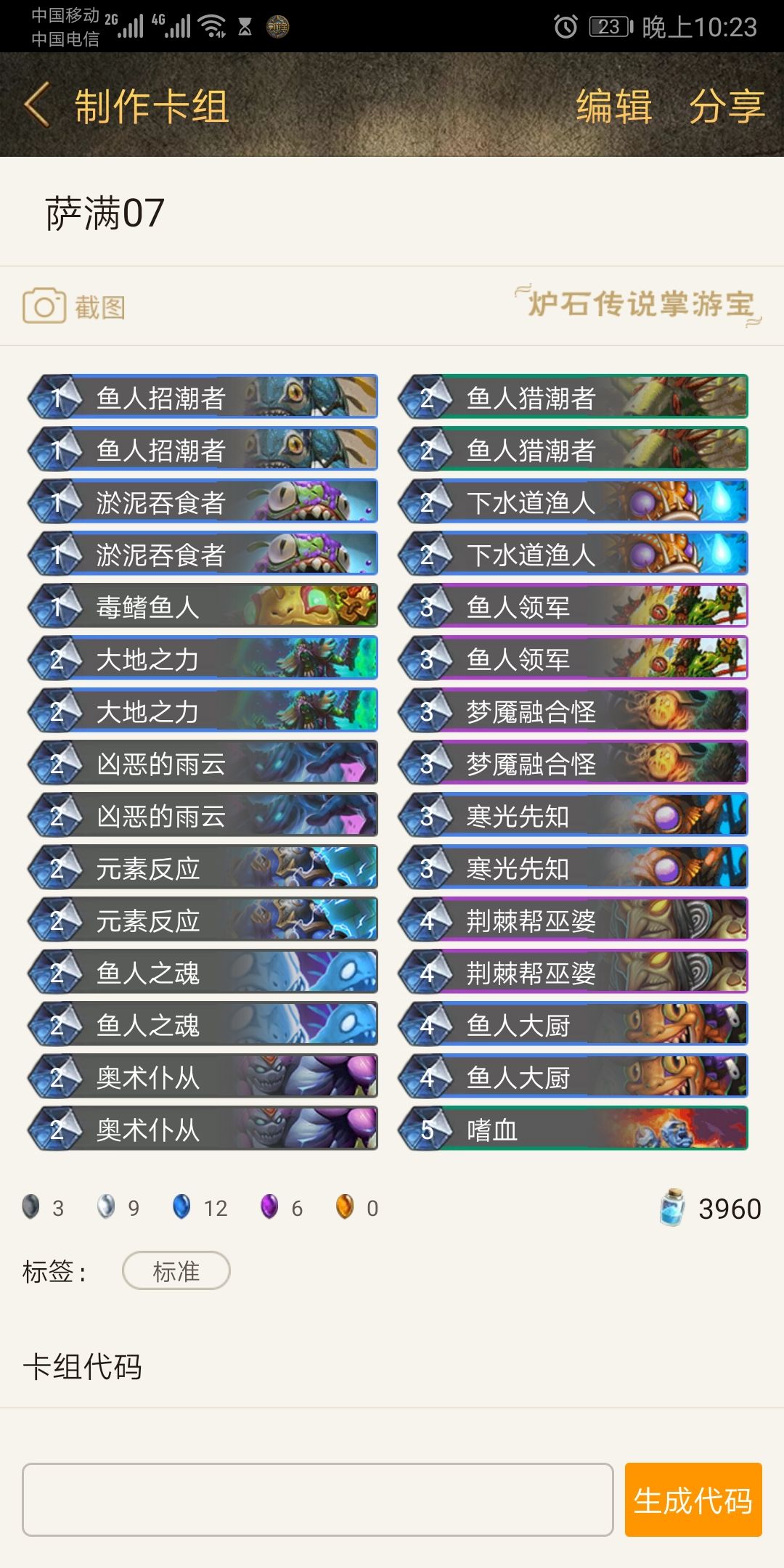 最初版本,思考怎么将元素加入鱼人体系中,因为便宜,元素给牌还不错,但缺少解卡,卡一血十分难受不说,复制的牌也没有多大用处