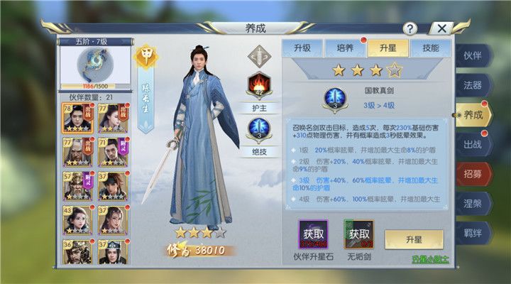 伙伴想要激活武器特效就需要升到4星。在升星的时候需要用到伙伴专属武器,在升星后会极大的增强伙伴的绝技能力,增强对职业的辅助能力。既然是叫伙伴专属武器,那就说明在游戏中每一种甲级或圣级伙伴都有属于自己的武器,例如陈长生的无垢剑,徐有容的桐弓,天机老人的神石天书等。想要给对应的伙伴提升星级就需要获得对应的伙伴武器。