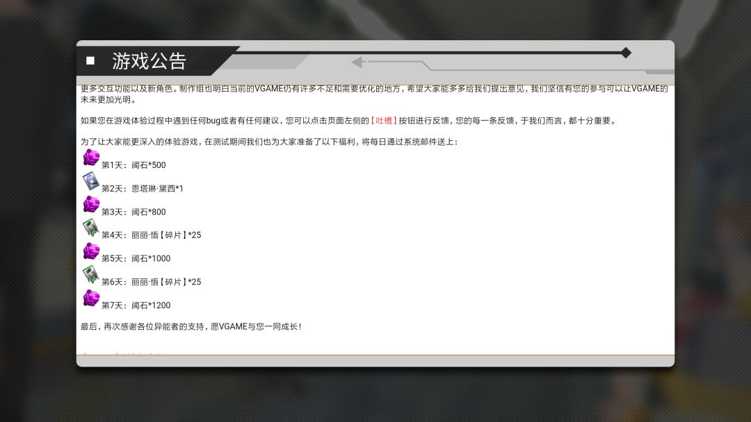 游戏中签到系统有大量的福利,毕竟是测试服,喜欢抽卡的可以一直玩下去了,还有每天邮箱会发放很多的奖励.
