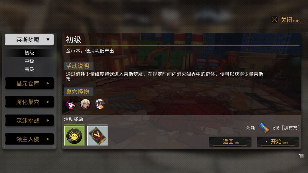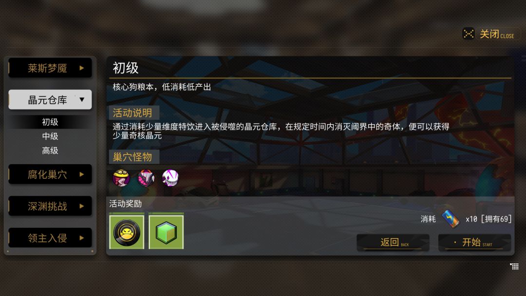 这是强化源石奇核的活动,每个活动都有掉落不同的材料,不同的难度,我们刚开荒就可以选择初级就好,如果有时间的话可以慢慢磨中等难度