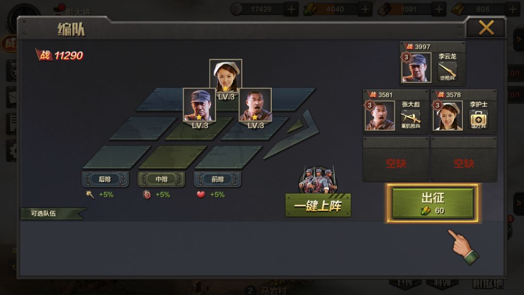 2、战场配置~不同的将领有不同的指挥特长,李云龙团长作为步枪兵的核心将领,擅长在前排冲锋,李护士作为医疗部队,适合围绕在步兵团队附近快速的为团队进行医疗。一场战斗中可以同时上阵5名将领,因此战场上将领配置是制胜关键!