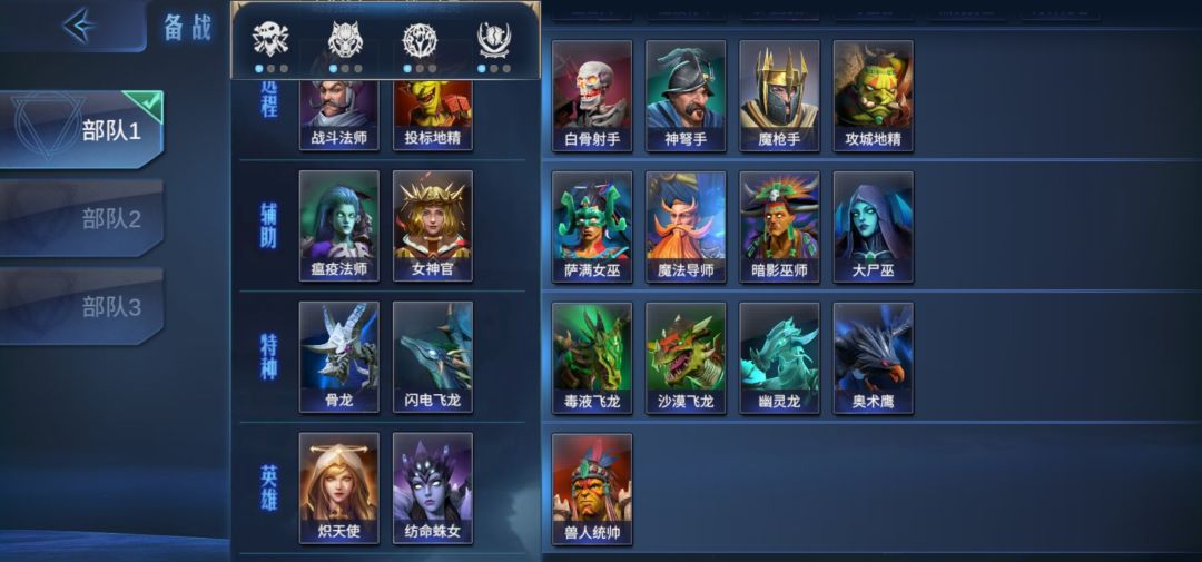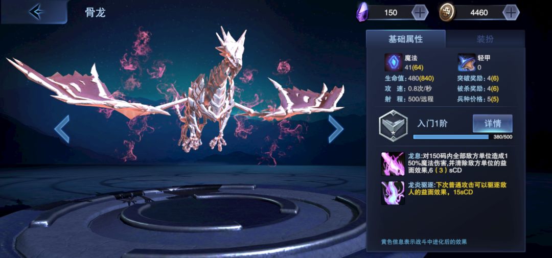 骨龙的1技能是对150码的敌方单位造成一个150%的魔法伤害,并且清除其益面效果,2技能则是发动后的下一次普攻会清除敌方单位的益面效果,特种单位我就讲下这个骨龙,每次战斗也是主要使用骨龙6:最后是一个英雄单位的使用心得,先看一下目前的3个英雄效果
