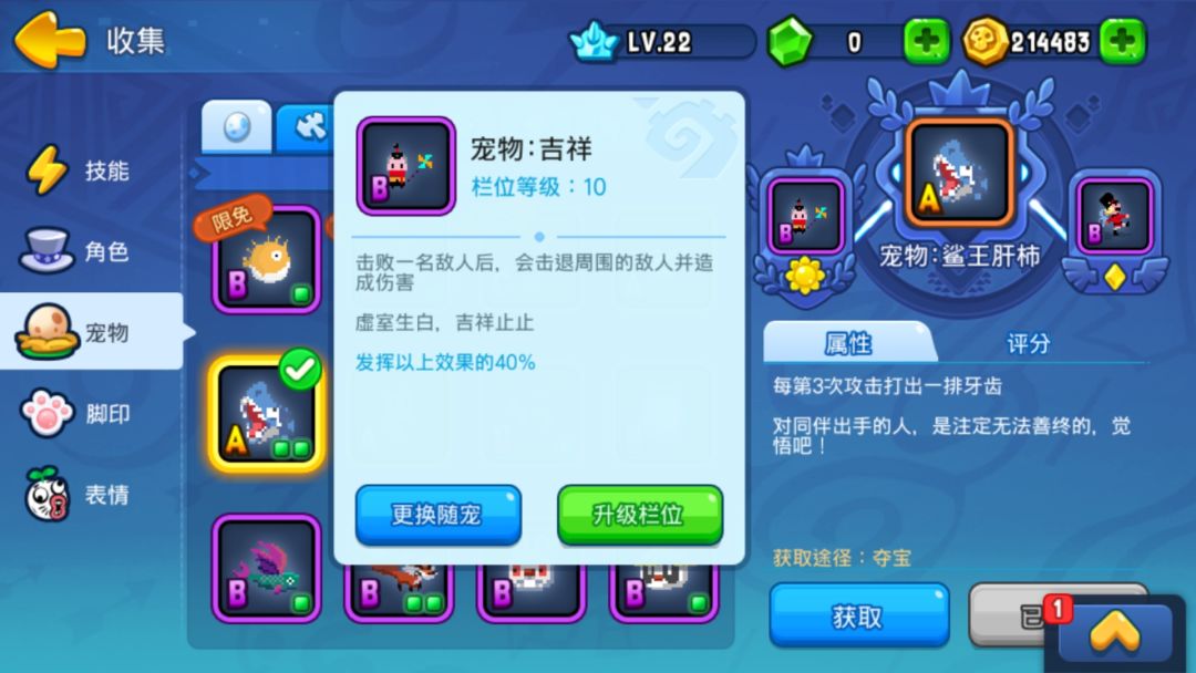 属性:每第3次攻击打出一排牙齿(欧皇(氪金)宠物 推荐随宠吉祥、夹子)