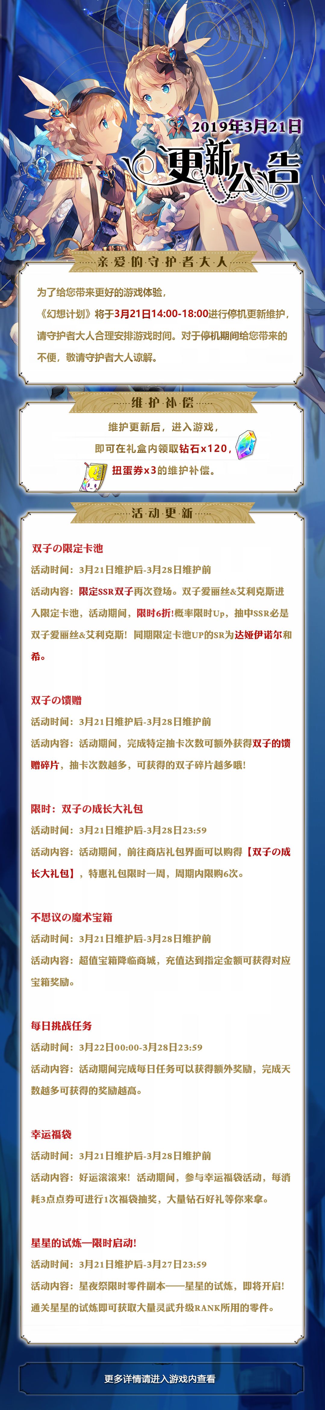 尊敬的守护者大人: 为了给您带来更好的游戏体验,《幻想计划》将于3月21日14:00-18:00进行停机更新维护,请守护者大人合理安排游戏时间。 维护更新后,进入游戏,即可在礼盒内领取钻石x120,扭蛋券x3的维护补偿。