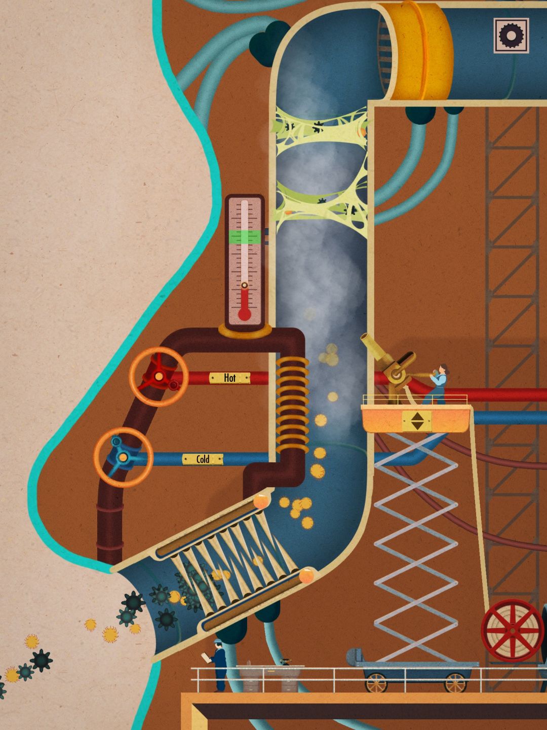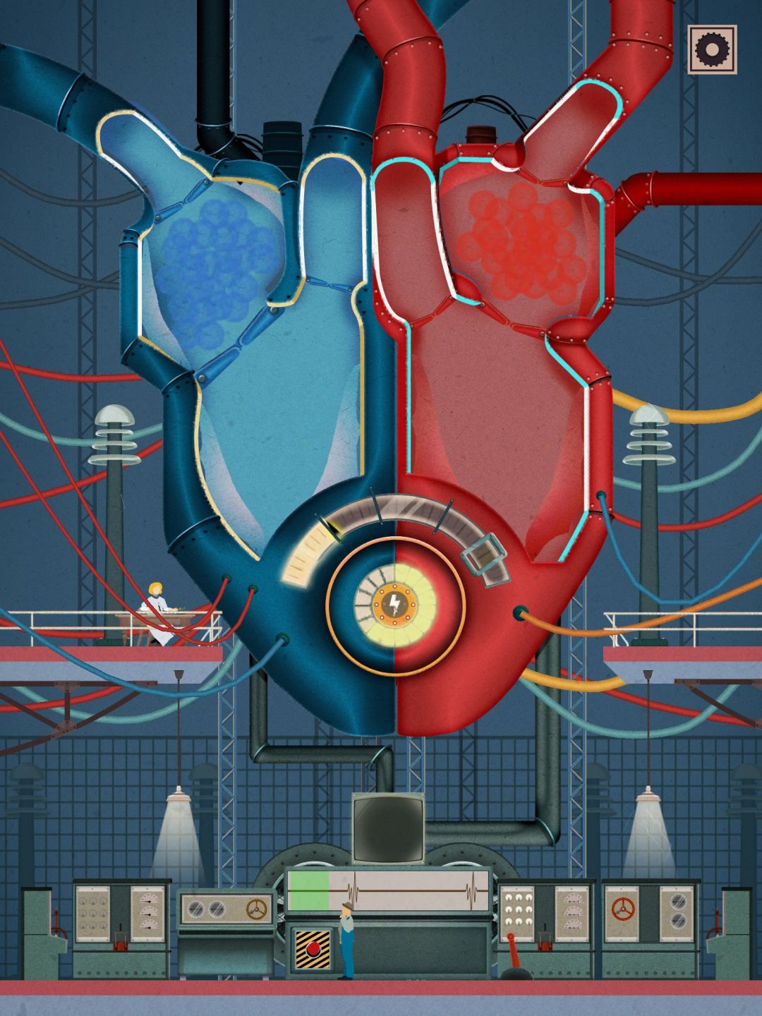 这一关很简单,先把下面的开关开到最大,然后转动舵轮给心脏增压,这一部分有四个阶段,每个阶段增压完毕后要按照心跳速度点下面的按钮。